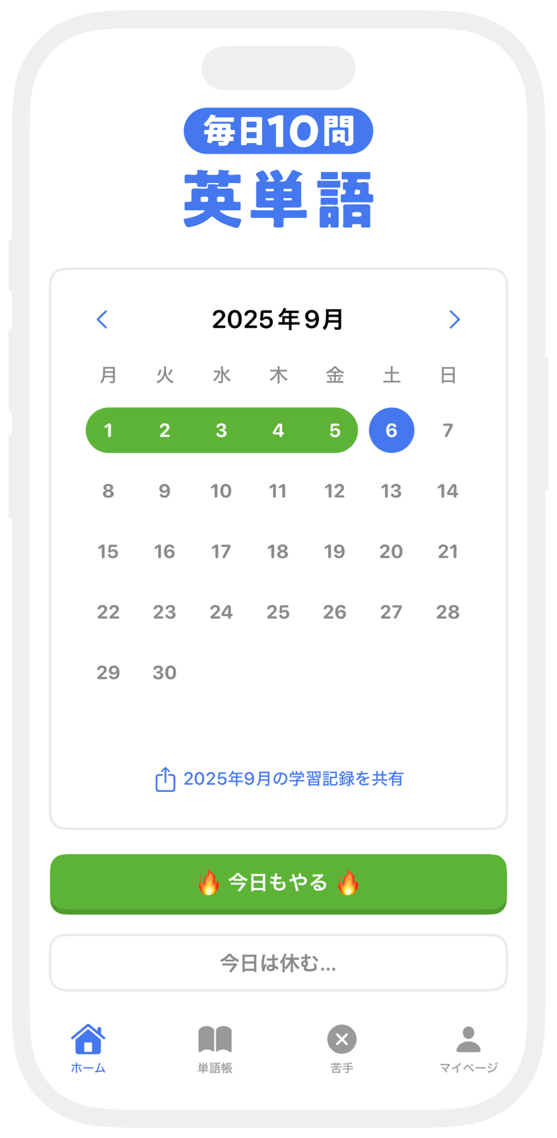学習した日はカレンダーに記録され、