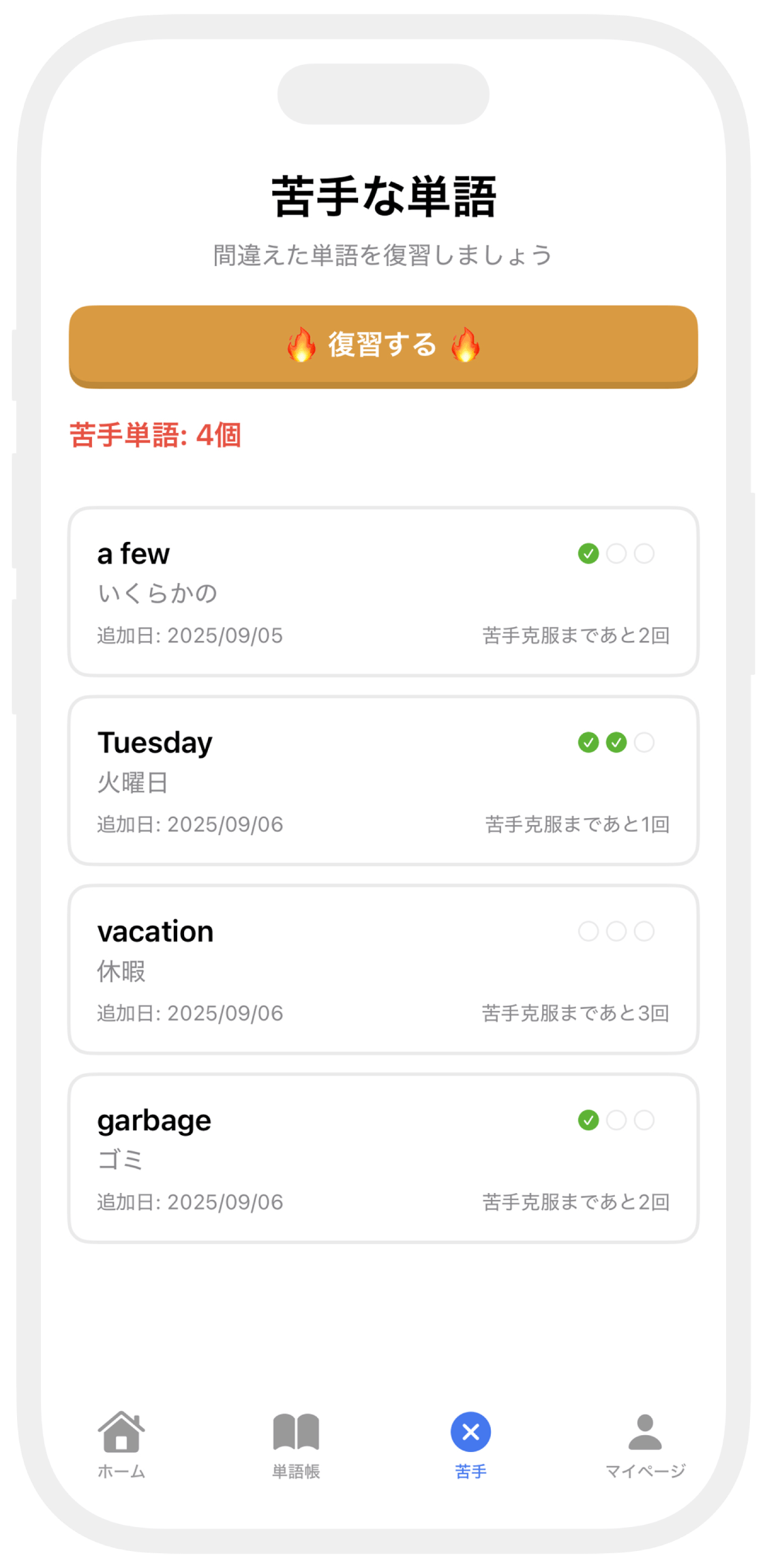 苦手単語は復習。